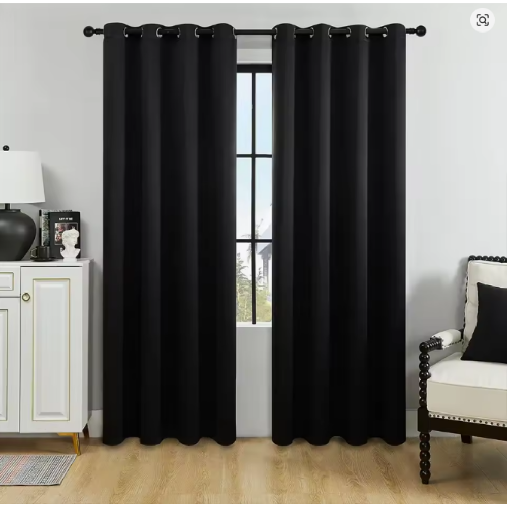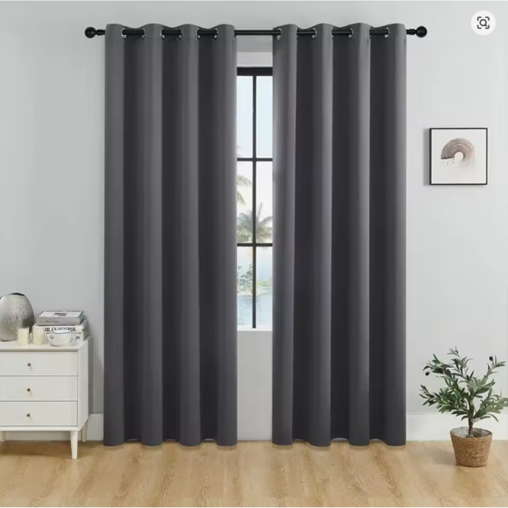 Gardinerna är försedda med öljetter upptill, vilket gör dem enkla att hänga upp på de flesta gardinstänger. De kan användas ensamma för en stilren look eller kombineras med ljusare gardiner för en mer dynamisk inredning.