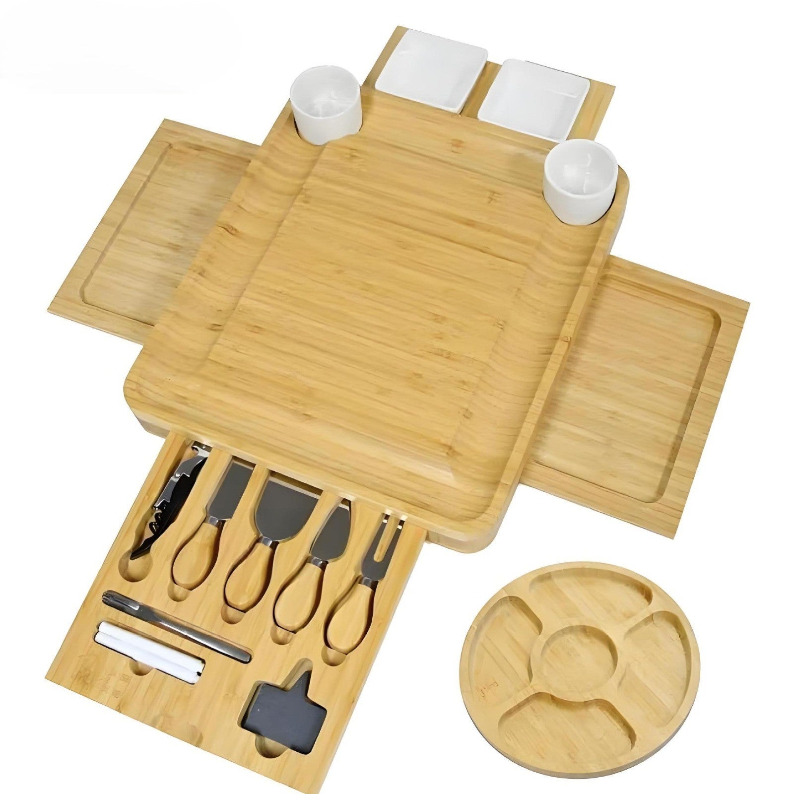 Lyft din nästa ost- eller charkkväll med denna smarta och eleganta serveringsbricka i hållbart material som består av miljövänlig 100% bambu. Den genomtänkta designen kombinerar stil, funktionalitet och praktisk förvaring för en komplett serveringsupplevelse.